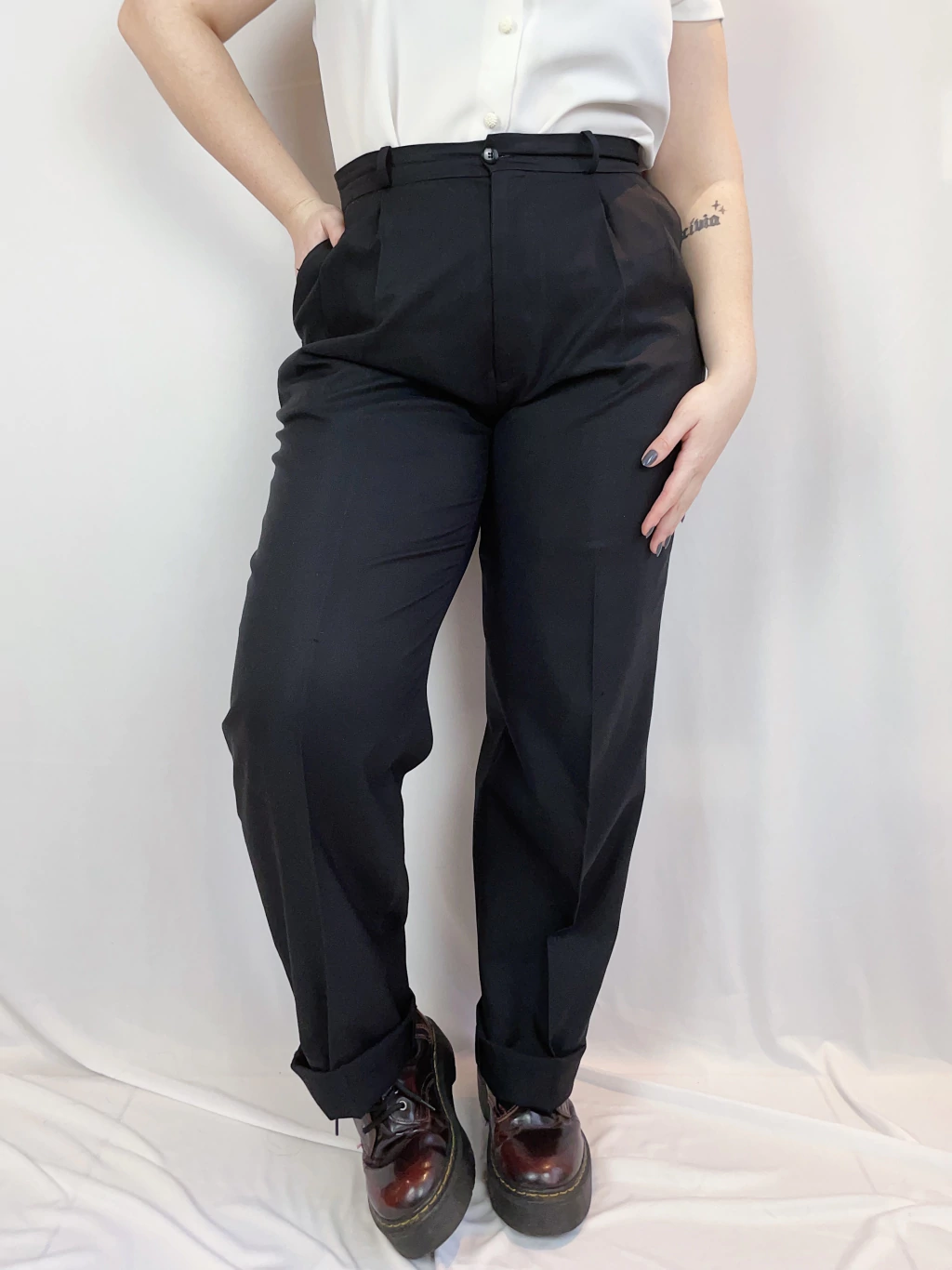 Peça produzida em tecido leve, não estica, possui cintura alta e modelagem tipo alfaitaria, o acabamento é levemente acetinado, os bolsos são funcionais e o caimento está lindo.