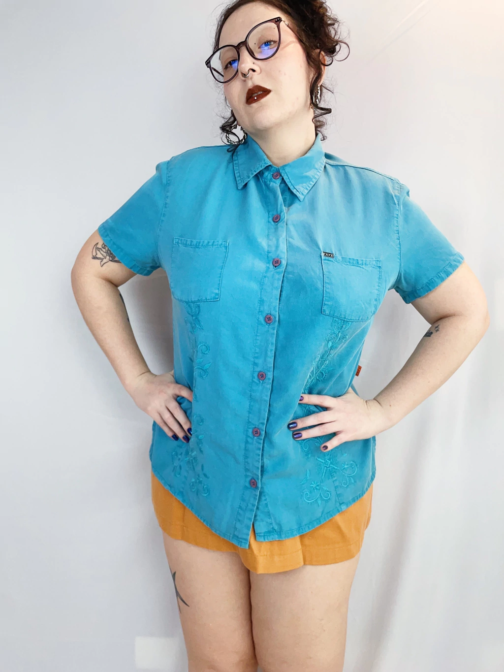 Peça vintage, produzida em sarja 100% algodão nesse tom lindo de azul, possui bolsos e bordado simétricos na parte frontal, modelagem baby, muito linda e fresquinha.