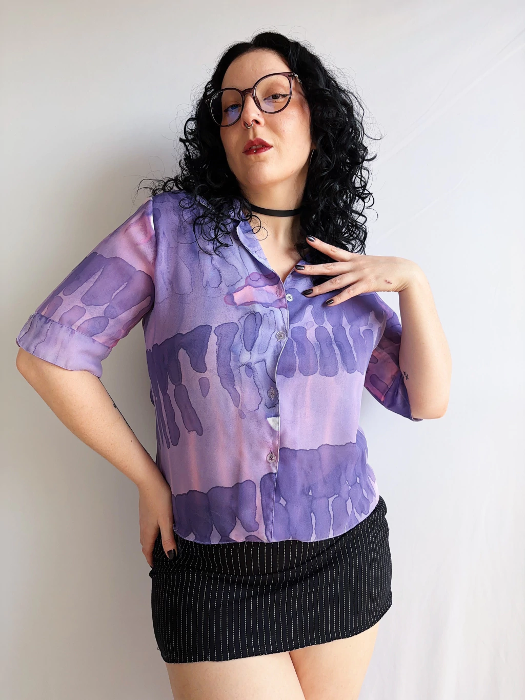 Peça vintage, produzida em crepe levemente translúcido nessa estampa abstrata linda em tons de roxo e rosa, a peça não estica e a modelagem está uma graça.