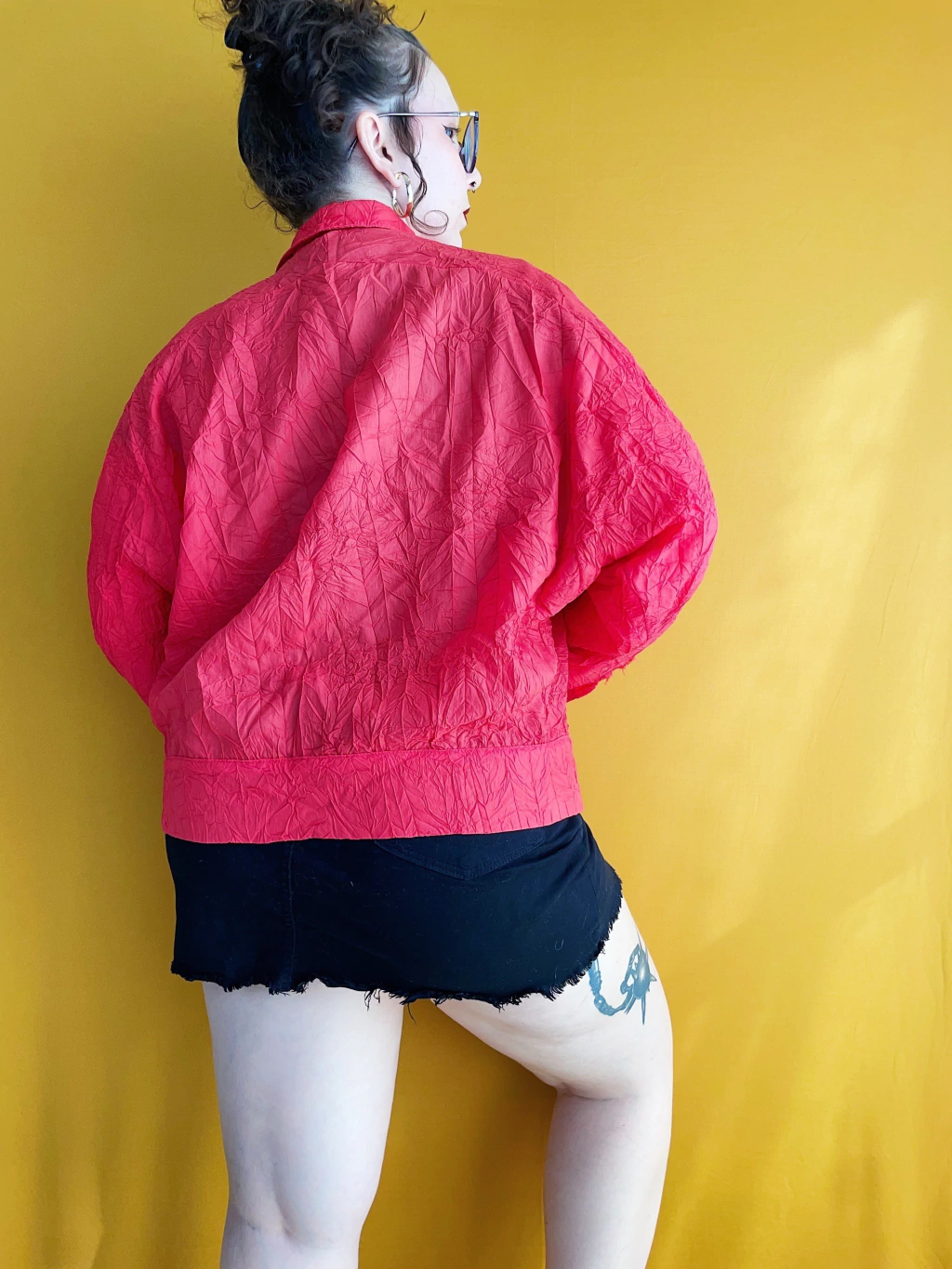 Peça vintage, produzida em tecido sintético levemente translúcido, não possui forro, modelagem tipo bomber jacket, os botões são de pressão e a cor está perfeita, muito confortável e ótima para dias mais amenos.