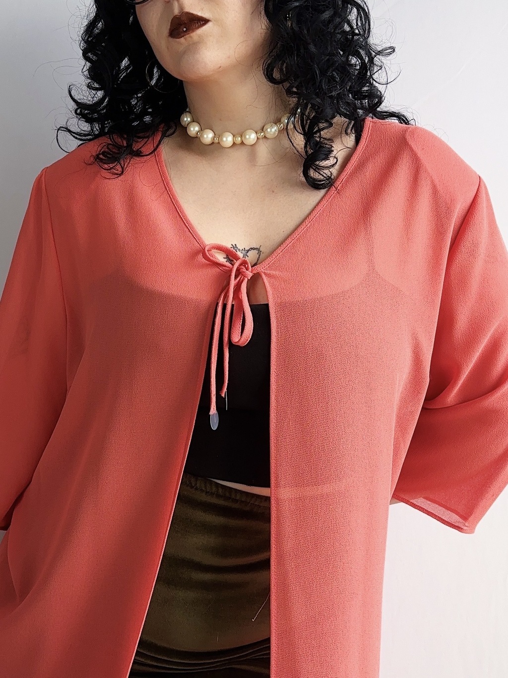 Peça produzida em crepe com transparência nesse tom lindo de coral, possui aplicações em paetês, fica lindo se usado aberto também.