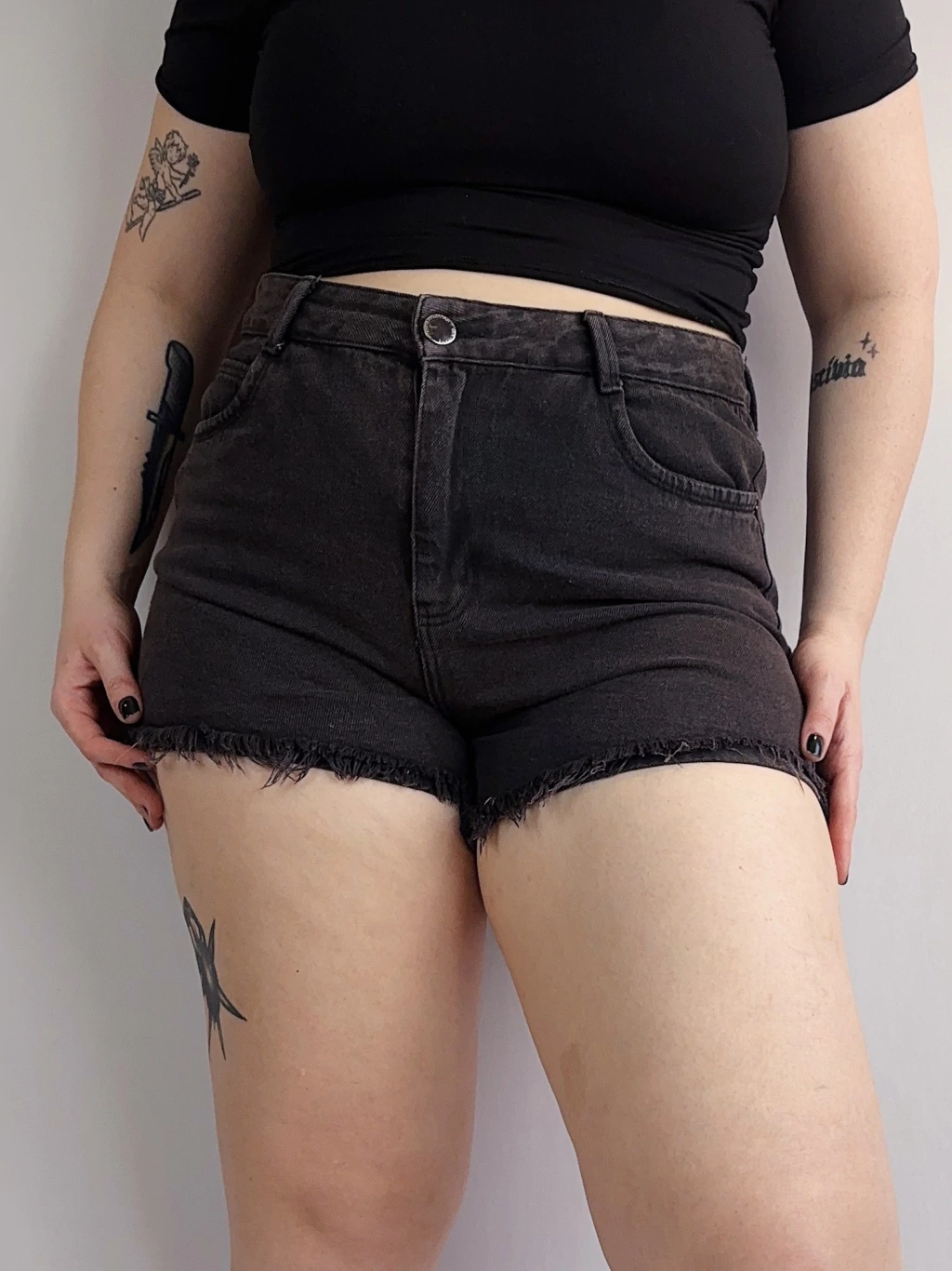 Peça produzida em jeans grosso 100% algodão, possui cintura alta, barra desfiadianha e não estica, está uma graça.