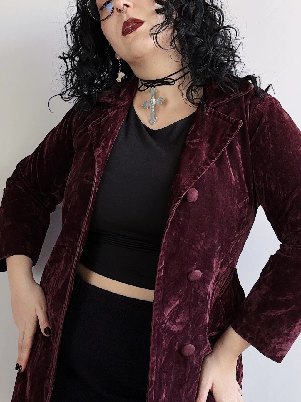 Peça vintage real, produzida em veludo grosso de ótima qualidade nesse tom lindíssimo de vinho, possui bolsos funcionais, botões forrados originais da época, o forro está intacto, peça única e rara, muito linda. (Possui pequenas marcas de uso no tecido na barra das mangas e na gola, mas nada que estrague o uso e beleza dela.)
