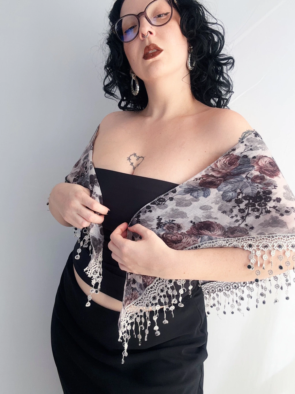 Peça produzida em malha de algodão com linda estampa de flores, possui franjas por todo seu comprimento, está um charme.